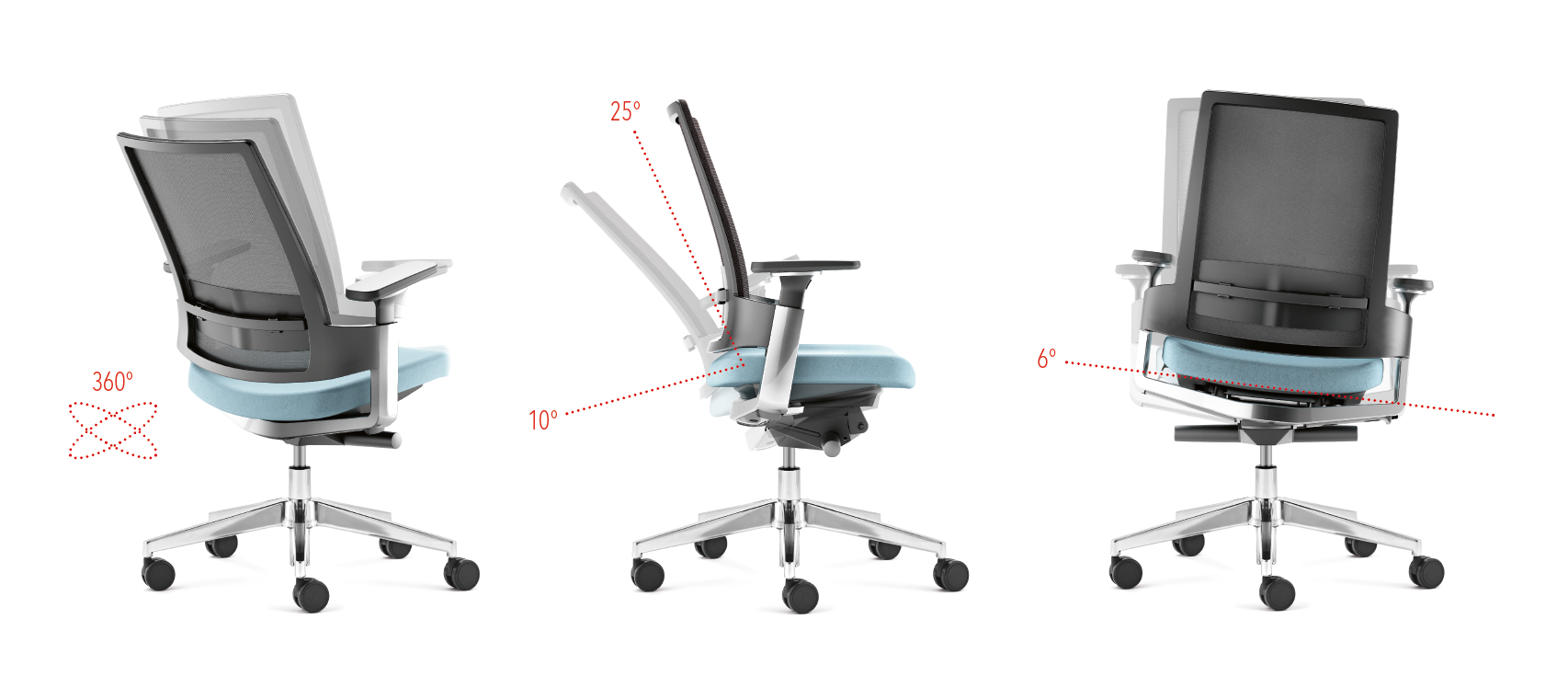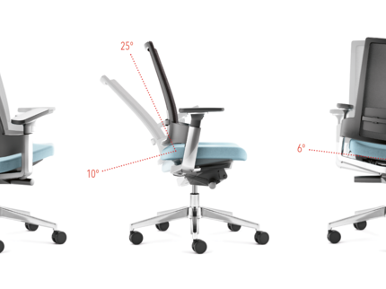 Sitz und Rückenlehne neigen sich synchron (Sitz 10°/Rücken 25°/seitliche Bewegung 6°), um eine fließende Unterstützung der Körperhaltung zu