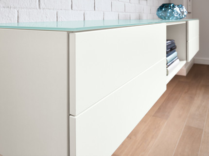 Materialien wie Hochglanz, Synchrondekore, fresh color und die 21 fm Dekore bieten dabei nicht nur in der Frontgestaltung individuelle Möglichkeiten. Ob Sideboard, Hängeregal oder Flügeltürenschrank, ob mit Schubkästen, Klappenschränken oder Schiebetüren, ob mit push to open oder mit Griffleiste – clear lässt sich in vielen Varianten kombinieren und steht auf vier verschiedenen Sockelsystemen.