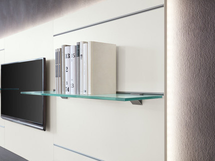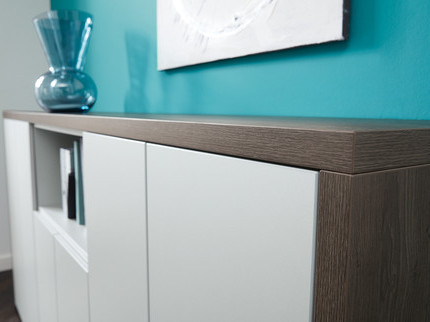 Materialien wie Hochglanz, Synchrondekore, fresh color und die 21 fm Dekore bieten dabei nicht nur in der Frontgestaltung individuelle Möglichkeiten. Ob Sideboard, Hängeregal oder Flügeltürenschrank, ob mit Schubkästen, Klappenschränken oder Schiebetüren, ob mit push to open oder mit Griffleiste – clear lässt sich in vielen Varianten kombinieren und steht auf vier verschiedenen Sockelsystemen.