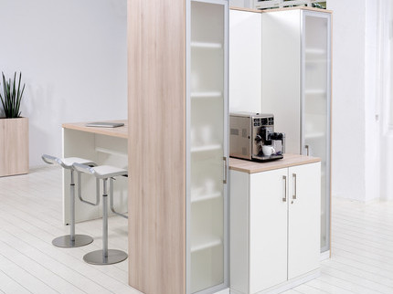 Sozusagen „backstage“ zeigt die Medienwand ihre ganze Vielseitigkeit. Clever kombiniert mit einer praktischen Pantry verwandelt sich die Medienwand in eine Cateringzone mit genügend Stauraum für alles, was man für einen gepflegten Cappuccino braucht.